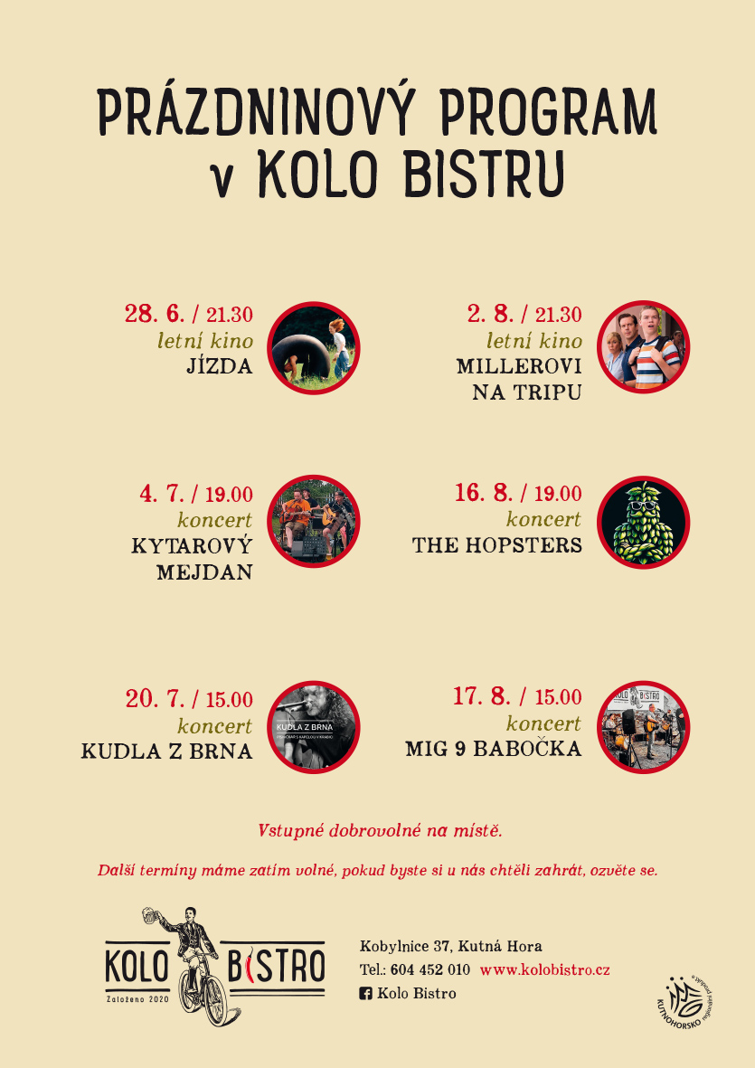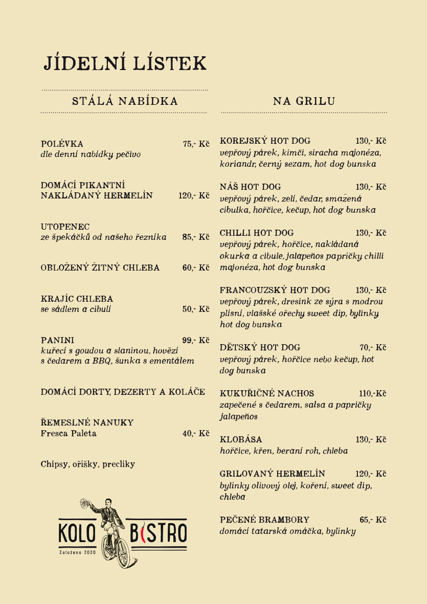 Vítáme vás na webu našeho rodinného Kolo Bistra, kde jsou všichni (nejen cyklisté!) vítáni. Nabízíme vám příjemný prostor v zrekonstruované stodole s velkou oplocenou zahradou, kde najdou své místo i nejmladší návštěvníci. Na páce nabízíme výběrové kávy, na pípě Bernarda a piva z malých řemeslných pivovarů. Pochutnáte si na domácí kuchyni z lokálních surovin, domácích dezertech, jídlech na grilu a mnoho dalšího. Během léta organizujeme na zahradě koncerty místních kapel a letní kino. Rádi pro vás uspořádáme soukromou oslavu nebo svatbu.